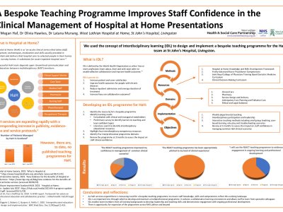 Hospital at Home (HaH) provides high acuity clinical care for patients in the community. HaH teams are varied and multidisciplinary. A successful HaH service depends upon streamlined communication between multidisciplinary team (MDT) members, facilitated by an integrated knowledge base. Whilst training protocols are under development, there are currently no published teaching programmes for HaH. We responded to this unique challenge by devising a teaching programme for the HaH team at St John’s Hospital, Livingston. Methods: We identified learning needs within our team with a preliminary