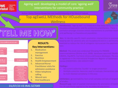Introduction The housebound population are growing in number, with a large proportion living rurally or in coastal areas, which increases the risks of isolation and health inequalities. This population are an under researched and underserved group (Public Health England, 2019). Being unable to leave the home is a factor for living in the poorest of health, which contributes to advancing levels of frailty, Curtis et al (2018). Considering the current focus of empowerment to ‘age well’ (NHS England Long Term Plan, 2019), a granular understanding of community focused ageing well interventions is