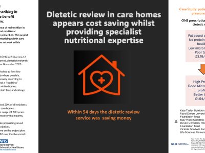 Introduction Prevalence of malnutrition in care homes is high and oral nutritional supplements (ONS) often prescribed. Prescription and monitoring of ONS use varies considerably within residential settings. Locally dietetics are not funded to visit care homes and input is limited. This project explored dietetic ONS prescribing within care homes in one primary care network within Devon, recording the potential impact on costs. Methods All patients prescribed ONS (n=50) across 16 care homes were reviewed, alongside referrals to dietetics (n=39) from November 2022-March 2023. Supplements were