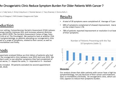 Introduction: In the cancer setting, Comprehensive Geriatric Assessment (CGA) reduces chemotherapy toxicity, improves QOL and increases advance directive completion (ASCO 2020: The Geriatric Assessment Comes of Age; Soto-Perez-de-Celis et al; The Oncologist). We wanted to look at whether CGA improved symptomatology, as patients attending our oncogeriatric clinic complained of a range of symptoms, related to their cancer, as well as other co-morbidities and frailty. Methods: We retrospectively analysed follow up clinic letters of patients who had attended the oncogeriatric clinic, between June