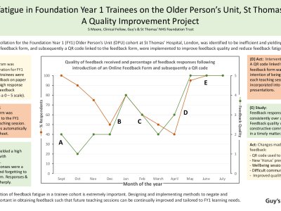 Introduction: On designing and leading the Foundation Year 1 (FY1) Older Person’s Unit (OPU) teaching programme at St Thomas’ Hospital, London (STH), it was identified that the method of feedback collation was inefficient and yielding poor quality feedback from FY1s. Feedback fatigue was high. Plan: FY1 trainees were initially asked to complete feedback for their FY1 OPU teaching on paper forms. This yielded a high response rate (100% of forms completed), but feedback quality was poor. The time taken to collate responses from the paper feedback forms was disproportionate to the quality of