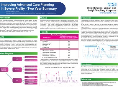 Introduction: NICE guidance recommends that clinical teams should identify patients who are approaching their final year of life. It advises using tools such as the Clinical Frailty Score (CFS) to identify this cohort. Wigan has a significant proportion of severely frail patients would would benefit from this conversation. The aim of this project was to increase the percentage of patients with severe frailty who have an advanced care planning (ACP) conversation during their hospital stay. Method: Retrospective data collected from discharge letters was used to identify patients aged >65 years