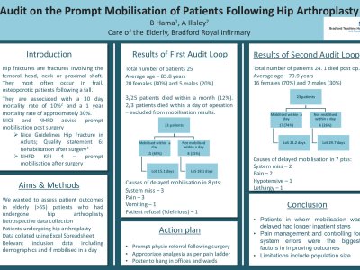 Hip fractures are fractures involving the femoral head, neck or proximal shaft. They most often occur in frail, osteoporotic elderly patients following falls. Hip fractures are associated with a 30 day mortality rate of 10% and a 1 year mortality rate of approximately 30%. NICE and NHFD advise prompt mobilisation post surgery - with patients being mobilised by the day after surgery at the latest: 1. Nice Guidelines Hip Fracture in Adults; Quality statement 6: Rehabilitation after surgery 2. NHFD KPI 4 – prompt mobilisation after surgery We carried out two audit cycles assessing the