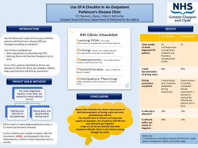 Introduction The UK Parkinson's Audit assesses whether patients with Parkinson's Disease (PD) are managed according to standards. Referring patients to physiotherapy (PT) and advising those with daytime sleepiness not to drive are two of these. In our clinic, patients identified as drivers are advised to inform the DVLA and will undergo a MOCA, sleep questionnaire and driving assessment. Project Aim Are we making early physiotherapy referrals and documenting driving status in new diagnosed outpatients? Methods Online notes of newly diagnosed patients over a 12 month period were reviewed. A
