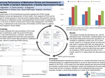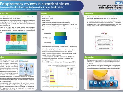 Introduction: Inappropriate polypharmacy is recognised as a contributing factor towards adverse outcomes in frail patients. Current efforts at national level are centred around primary care initiatives in completing structured medication reviews (SMR) where shared decision making takes place with open discussion around risks and benefits of treatments. The aim of this review was to assess whether recommendations for discussion in SMR have been adopted for patients attending frailty bone health clinic led by Consultant Pharmacist, in hospital outpatient setting. Method: Retrospective analysis