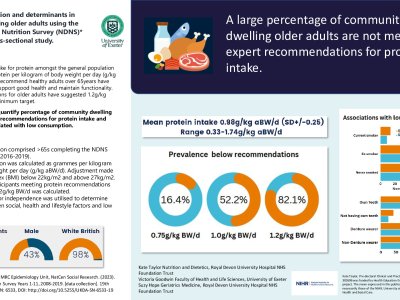 Introduction Reference nutrient intake for protein amongst the general population is 0.75 grammes of protein per kilogram of body weight per day (g/kg BW/d). Expert groups recommend healthy adults over 65years have 1.0-1.2g/kg BW/d to support good health and maintain functionality (Deutz, Bauer and Barrazoni, Clinical Nutrition, 33(6):929-36). A recent paper suggested age specific recommendations of 1.2g/kg BW/d (Dorrington, Fallaize and Hobbs, Journal of Nutrition, 150(9):2245-2256). This study aimed to quantify percentage of community dwelling older adults meeting recommendations for protein