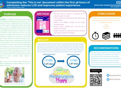 Introduction by 2025 over 1 million people will be diagnosed with dementia in the UK. Person-centred care is the best practice for looking after patients with dementia, but this is often not managed well within acute hospital settings. This can result in poor hospital experience and longer than necessary stay. A snapshot of data was taken retrospectively from May 2023 within the ED & AMU at an acute hospital. This showed an average length of stay (LOS) of 5.25 days. A study in 2013, which implemented This Is Me (TIM) documents in hospital saw a reduction in inpatient falls, improved patient