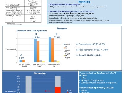 Introduction: The incidence of fragility fractures is rising with increased life expectancies. Most hip fractures require surgery. Acute kidney injury (AKI) is a preventable clinical syndrome that raises the risk of mortality. The aim of this study was to investigate the prevalence of AKI in hip fracture patients. Methods: Data relevant to reported risk factors for developing AKI were collected before and after surgery within hip fracture patients in 2020. This included serum blood tests, anthropometric data, surgical factors and length of inpatient hospital stay. Results: A total of 190