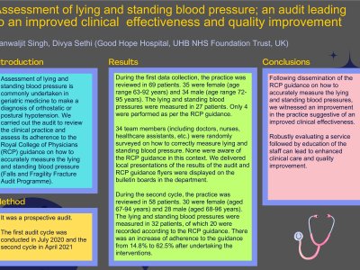 Improving the assessment and management of blood pressure in older populations Introduction Managing blood pressure in patients above 65 years old remains controversial with limited evidence in relation to balancing cardiovascular benefit and risks of postural hypotension. National guidelines highlight appropriate medications and contraindicated drugs. An initial audit identified a large proportion of elderly Wigan borough residents being on inappropriate medication alongside poor compliance in assessing and managing abnormal blood pressure. This quality improvement project aims to increase
