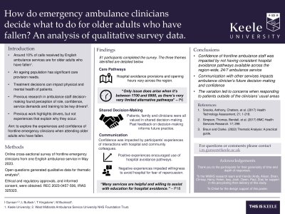 Introduction: Around 10% of calls received by English ambulance services are for older adults who have fallen 1; with an ageing population there are significant care provision needs. Decision-making on the treatment for people who fall, can impact their future physical and mental health. Previous research in decision-making of ambulance staff found perception of role, confidence, service demands and training to be key drivers 2. The previous work highlighting drivers, but not the experiences that explain why they occur, leads this study aim to determine the experiences and confidence of