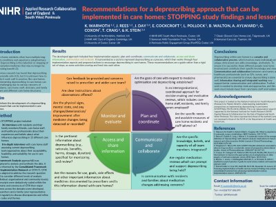 Introduction: Care home residents often have multiple long-term conditions and experience polypharmacy. Deprescribing is the reduction or stopping of prescription medicines that may no longer be providing benefit. Previous research has found that deprescribing is generally safe but it is unknown how to make it work well in practice, like care homes. Methods: Using the findings from the NIHR-funded STOPPING project, which aimed to support the development of better deprescribing practice approaches within care homes, considering different views and environments, recommendations for designing a