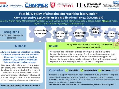 Introduction CompreHensive geriAtRician-led MEdication Review (CHARMER) is a behaviour change intervention to support geriatricians and pharmacists to proactively deprescribe inappropriate medicines with older adults in hospital. The intervention comprises: formulating a deprescribing action plan, workshops, benchmarking reports and weekly briefings between geriatricians and pharmacists. We assessed feasibility and acceptability of the CHARMER intervention and study processes. Method A two-arm purposive allocation feasibility study was undertaken in four hospitals (three intervention, one