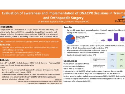 Introduction: In-hospital CPR has survival rates of 15-20%[ BMA. Decisions on CPR, 3 rdedition, 2016], further reduced with frailty and multimorbidity. Successful CPR is associated with significant morbidity and prolonged suffering. Do not attempt resuscitation (DNACPR) is an advanced medical decision, aimed at preventing harm where CPR is considered futile.[ GMC Guidance.p128-145] Aims: To reduce the burden of inappropriate CPR within surgical specialties using the following standards: DNACPR status reviewed on admission, and all decisions implemented within 24hours of clerking. DNACPR