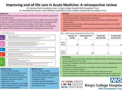 Background End-of-life (EOL) care aims to anticipate, prevent and treat symptoms experienced by the dying patient. An EOL care strategy described by King’s Health Partners (KHP) outlines the ‘ICARE’ framework, created from the five priorities for the dying patient, giving generalist hospital teams a memorable prompt to consider holistic needs of patients. We aim to reconcile performance of Acute Medical Unit (AMU) in providing EOL care, against KHP's framework, to reduce patient suffering and improve care. Methods A prospective review was performed of all AMU deaths from March-September 2021