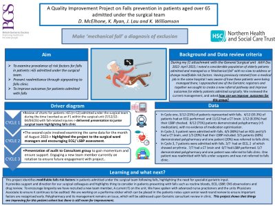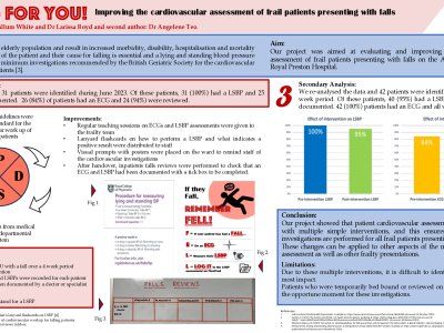 Title: A quality improvement project on falls prevention in patients admitted under the surgical team. Modifiable and non-modifiable factors contribute to falls in older people. Our aim was to examine prevalence of risk factors for falls in patients >65 admitted under the surgical team and prevent readmittance through signposting to falls clinic. The first cycle of this QIP involved a review of all sets of charts for patients >65 (n=12) admitted under the surgical team with fall-related injuries between Dec 2022- April 2023. Parameters examined included whether an electrocardiogram (ECG), CT