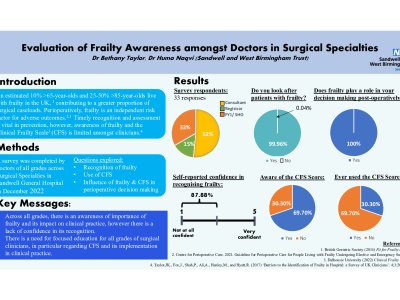Background: An estimated 10% >65-year-olds and 25-50% >85-year-olds live with frailty in the UK, 1 making up a greater proportion of surgical caseloads. Perioperatively, frailty is an independent risk factor for adverse outcomes. 2,1 Timely recognition and assessment is vital in prevention, however, awareness of frailty and the Clinical Frailty Scale 3 (CFS) is limited amongst clinicians. 4 Methods: A survey was completed by doctors of all grades across surgical specialties in Sandwell General Hospital. Questions explored recognition of frailty, use of CFS, and their influence in perioperative