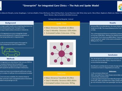 Background: The development of integrated care occurs alongside climate emergency, where transport is a large contributor to carbon emissions (1). Care previously delivered in hospital outpatients, or a central ‘hub’ is now being delivered in integrated care clinics, “spokes”. We aimed to assess the environmental impact of transport to integrated care clinics. Methods: Geriatric Medicine Integrated Care attendances from January 2023 to March 2023 were included. Distance from the patient’s home address to the location of Integrated Care Clinic(spoke), and to the affiliated hospital(hub) were
