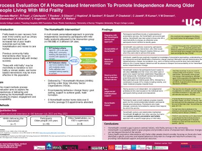 Introduction: Frailty is a condition that makes it increasingly difficult for individuals to recover from adverse health events and gradually erodes independence. NHS interventions in England have focused on those with more severe frailty. We tested HomeHealth, a home-based, tailored, multi-domain (six-session) behaviour change intervention to promote independence in the over-65s living with mild frailty, in a RCT recruiting 388 people (intervention 195; control 193). HomeHealth was delivered by the voluntary sector in three diverse areas and addressed mobility, nutrition, socialising, and