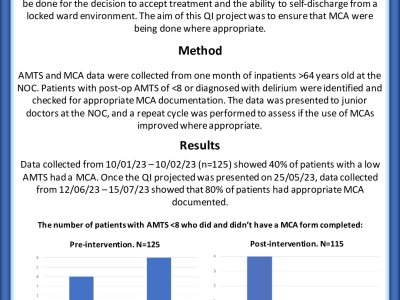 Introduction The Mental Capacity Act is designed to protect patients who may lack the mental capacity to make decisions about treatment. At the Nuffield Orthopedic Centre (NOC) in Oxford, nurses obtain a baseline AMTS during the pre-operative assessment clinic. Following on from this, any patient over 64 years old that is seen by the orthogeriatrics team will have a post-op AMTS done to assess for cognitive impairment. If the AMTS is less than 8, or the patient is clinically believed to be delirious, then an MCA form will be completed for the decision to accept treatment. The aim of this QI