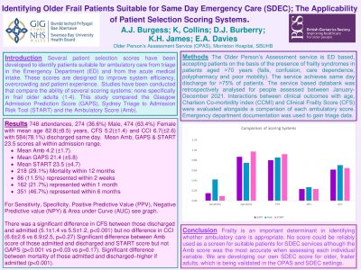 Aim: Several patient selection scores have been developed to identify patients suitable for SDEC from triage in Emergency Departments (ED) and the acute medical intake. Scores are designed to improve system efficiency, overcrowding and patient experience. Studies have been conducted that compare these; none in frail older adults. This study compared the Glasgow Admission Prediction Score (GAPS), Sydney Triage to Admission Risk Tool (START) and the Ambulatory Score (Amb). Methods: The Older Person’s Assessment service (OPAS) is ED based, accepting patients with frailty syndromes aged >70 years