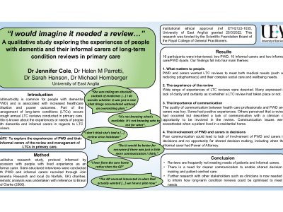“I would imagine it needed a review…” A qualitative study exploring the experiences of people with dementia and their informal carers of long-term condition reviews in primary care Introduction Multimorbidity is common for people with dementia (PWD) and is associated with increased healthcare utilisation and poorer outcomes. Part of the management of long-term conditions (LTCs) occurs through annual LTC reviews conducted in primary care. Little is known about the experiences or needs of people with dementia and informal carers in regard to LTC reviews. Aim To explore the experiences of PWD and