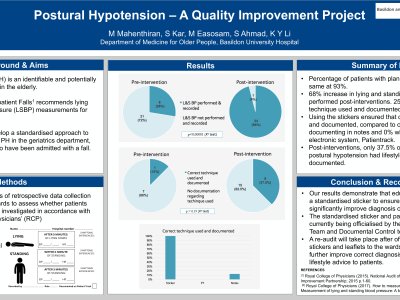 INTRODUCTION Postural hypotension (PH) is an identifiable and potentially reversible cause of falls in the elderly patients admitted to hospital. The National Audit of Inpatient Falls recommends lying and standing blood pressure (LSBP) measurement for patients aged over 65. Our project aims to review current clinical practice and to develop a standardised approach to correctly investigate and manage PH in patients admitted following a fall to the geriatric department. METHOD: We performed two cycles of retrospective data collection across three geriatric wards, looking at percentage of