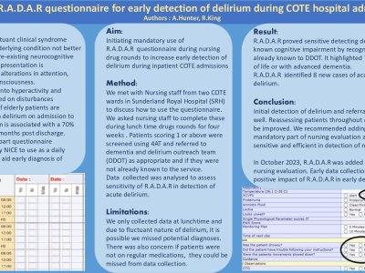 Background: Delirium is a fluctuant clinical syndrome caused by an underlying condition not better explained by a pre-existing neurocognitive disorder. Clinical presentation is characterised by alterations in attention, cognition and consciousness. It is categorised into hyperactivity and hypoactivity based on behaviours displayed. 25% of elderly patients are diagnosed with a delirium on admission to hospital. Delirium is associated with a 70% mortality rate 6 months post discharge. R.A.D.A.R is a 3 part questionnaire recommended by NICE to use as a daily screening tool to aid early diagnosis