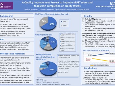 Background: Nutrition is one of the cornerstones of healthy aging. As we age there are many changes in our bodies, including decreased appetite and poor dentition, that contribute to increasing malnutrition. The MUST (Malnutrition Universal Screening Tool) score is a quick and effective tool to assess this. Aim: In this project, we aimed to review MUST score and food chart completion on the frailty wards at EDGH to attempt to improve the nutrition of elderly patients. Methods: The charts of 75 patients were reviewed over a period of one month. Following this, a training program for all the