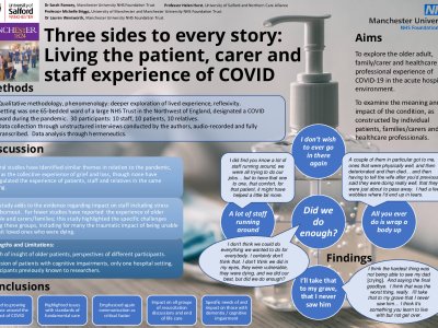 Introduction When COVID-19 first entered our world in March 2020 and the country went into lock down the NHS braced itself for one of its biggest challenges of this century. Older, frail patients were in the highest risk group, with those in care homes not only at higher risk of death, but higher risk of contracting COVID-19, often suffering more psychological disturbances (Hewitt et al., 2020; Numbers & Brodaty, 2021). This study was conceived by two nurse researchers working throughout the pandemic on a COVID ward for predominantly older people, aiming to capture the experiences of patients