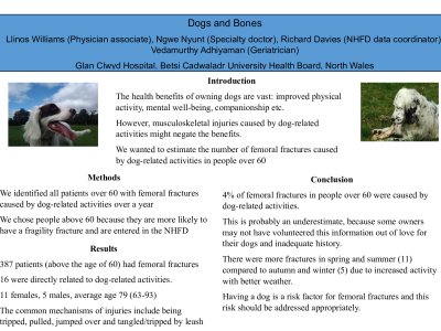 Introduction The health benefits of owning dogs include improved physical activity, mental well-being, companionship, and so forth. However, musculoskeletal injuries caused by dog-related activities might negate the aforementioned benefits. The aim of this study was to estimate the number of femoral fractures directly linked to dog-related activities in people above the age of 60. Methods In this observational study, we included all patients above the age of 60 with femoral fractures caused by dog-related activities, over a one-year period (June 2022 to May 2023). We chose to include people