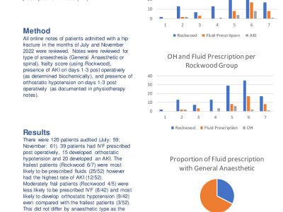 Introduction The patients most often admitted with a hip fracture are older adults, many of whom are frail. The Scottish Hip Fracture Standards recommend that all patients have fluid assessment and are mobilised by the end of day 1 post operatively. We set out to look to see which patients are most at risk of acute kidney injury (AKI) and orthostatic hypotension (OH) post operatively and whether this was linked to the prescription of iv fluids (IVF). Method All online notes of patients admitted with a hip fracture in the months of July and November 2022 were reviewed. Notes were reviewed for
