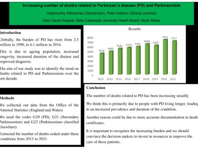 Introduction The burden of PD has exponentially risen from 2.5 million in 1990, to 6.1 million in 2016 (PD Collaborators. Lancet Neurol. 2018; 17(11):939-53). This is due to ageing population, increased longevity, increased duration of the disease and improved diagnosis. The aim of our study was to identify the trend on deaths related to PD and Parkinsonism over the last decade. Methods We collected our data from the Office of the National Statistics, using codes G20 (PD), G21 (Secondary Parkinsonism) and G22 (Parkinsonism classified elsewhere), to extract the number of deaths coded under