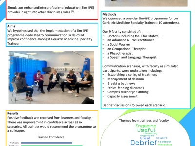Background Understanding human factors involved in patient care is a focus of the Geriatric Medicine Training curriculum including the leadership of and communication within an interprofessional team. Geriatric Medicine Specialty Trainees (ST4+) need advanced communication skills and confidence in managing complex situations. Simulation-enhanced Interprofessional Education (Sim-IPE) can be used to provide insight into other disciplines roles. We hypothesised that the implementation of a Sim-IPE programme dedicated to communication skills could improve confidence. Method We organised a one-day