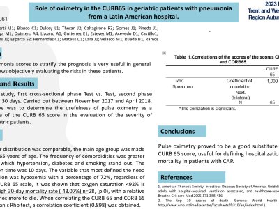 Introduction: The use of pneumonia scores to stratify the prognosis is very useful in general terms, since it allows objectively evaluating the risks in these patients. Methods: mixed type open study, first cross-sectional phase Test vs. Test, second phase follow-up at 8 and 30 days. Carried out between November 2017 and April 2018. The main objective was to determine the usefulness of pulse oximetry as a substitute for urea of the CURB 65 score in the evaluation of the severity of pneumonia in geriatric patients. Results: 65 patients, gender distribution was comparable, the main age group was