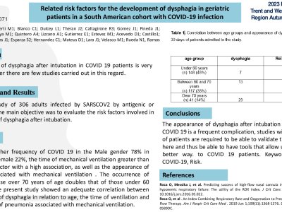 Introduction: The appearance of dysphagia after intubation in COVID 19 patients is very frequent, however there are few studies carried out in this regard. Methods: Retrospective study of 306 adults infected by SARSCOV2 by antigenic or molecular test. The main objective was to evaluate the risk factors involved in the appearance of dysphagia after intubation. Results: There was a higher frequency of COVID 19 in the Male gender 78% in relation to the Female 22%, the time of mechanical ventilation greater than 14 days was a factor with a high association, as well as the appearance of pneumonia