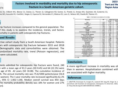 Introduction: Mortality after a hip fracture increases compared to the general population. The main objective of this study is to examine the incidence, trends, and factors associated with mortality in patients with osteoporotic hip fractures. Methods: This is a retrospective cohort study from a South American hospital. Patients older than 65 years with osteoporotic hip fracture between 2015 and 2018 were identified. Demographic data and comorbidities were obtained. The incidence rate, standardized mortality rate, trend (Poisson regression), and risk (hazard ratio) were calculated. Results: A