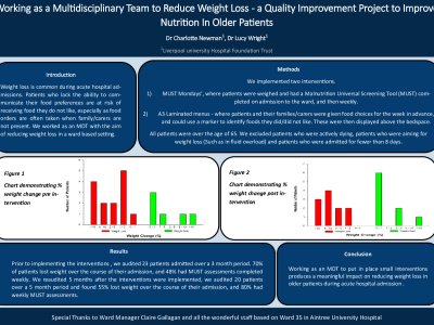 Introduction Weight loss is common during acute hospital admissions, and can be devastating to the older patient where weight loss is associated with an increase in mortality over a 12 month period. Patients who lack the ability to communicate their food preferences are at risk of receiving food they do not like, especially as food orders are often taken when family/carers are not present. Methods While working on a Department of Medicine for Older People and Stroke (DMOPS) ward, we worked with the Multidisciplinary team (MDT) with the aim of reducing weight loss. We implemented two