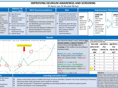 The 4AT Score is a simple tool recommended by NICE to help detect Delirium in everyday practice. In QEH Gateshead, clerking sheets include this score however it is frequently missed by admission doctors. Our QIP standard was that all patients >65 should be screened for Delirium in accordance with NICE Guidance and to improve this. Clerking sheets were audited to assess completion of 4AT scores. Improvement Methodology included prompt cards on working computers, posters in handover rooms, verbal reminders and quick teaching after morning handover. Run charts shows improvement in patients >65
