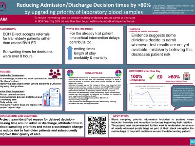 Background Time critical intervention delays contribute to increased waiting times, length of stay, worsening morbidity, and mortality for the already frail patient. Evidence suggests some clinicians decide to admit whenever test results are not yet available; mistakenly believing this decreases patient risk. Within one day, this project reduced waiting times for decision makers by upgrading the blood sample processing priority so results are available sooner. Method Our Quality Improvement (QI) team leader spent one shift observing practices in the Emergency Department, noting ED blood