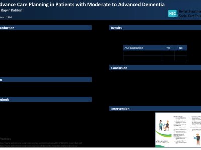 Introduction Advance care planning is a cornerstone of holistic care in patients with dementia. I conducted a quality improvement project (QIP) in Musgrave Park Hospital on the Orthogeriatrics Ward. The QIP focused on advance care planning in patients with moderate to advanced dementia. Method The target cohort was post-operative fracture patients with a formal diagnosis of dementia. Patients with moderate to advanced dementia were identified using the clinical frailty scale. Once a patient was identified, I ascertained whether the patient had capacity. If the patient was not deemed to have