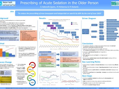 Introduction: Anti-psychotics and benzodiazepines are commonly prescribed for older people. They are usually indicated in the short term for delirium and agitation. There are known risks associated with these drugs in the older population including functional decline, increased falls risk and overall mortality. Moreover, chemical sedation is a form of restraint and deprives patients of their liberty. Sedative prescribing should be protocol driven and preceded by non-pharmacological intervention. However, these prescriptions are often initiated prematurely and evade review, continuing in the