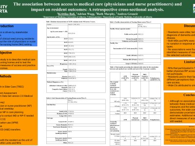 Introduction: There is a high level of clinical need among residents but little is known about the role of physicians or nurse practitioners (NP) in the nursing home (NH) setting. Our objective was to test for associations between physician and nurse practitioner (NP) presence on care units and outcomes among nursing home (NH) residents. A retrospective cross sectional analysis of secondary data collected in the Translating Research in Elder Care (TREC) study during 2019-20. The sample consisted of 10,888 residents across 320 care units in 92 facilities. Methods: We used TREC Survey data