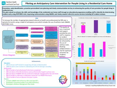 Unlike nursing homes, which have a qualified nurse on duty 24 hours, residential homes offer a social care model and are managed by a senior care assistant. This may increase the risk of admission to the emergency department (ED). The 45 bedded residential care home and associated GP medical practice in this pilot reported poorly communicated, inappropriate, and duplicate referrals to the practice, with nearly half of admissions to the emergency department occurring without professional assessment of any kind. The pilot aimed to enable care home staff to improve identification of residents at
