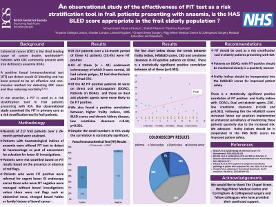 Introduction: Faecal-immunochemical test is employed as a screening tool for colorectal cancer. Our observational study examined the FIT in primary care as a risk stratification tool in frail patients. Method: The records of 217 frail patients over a 24-month period were analysed. Patients with haematological indices of anaemia were offered FIT to detect GI haemorrhage as part of assessment for selection for lower GI investigations. Patients were risk stratified based on FIT results based on the presence or absence of red flags. Patients who were FIT positive were referred for urgent lower GI