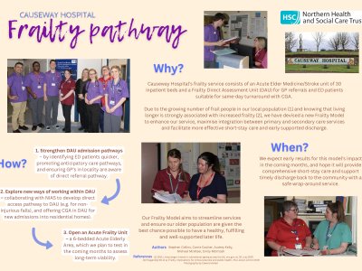 Introduction Causeway Hospital’s frailty service consists of an Acute Elder Medicine/Stroke unit of 30 inpatient beds and a Frailty Direct Assessment Unit (DAU) for GP referrals and EmergenIntroductioncy Department (ED) patients suitable for same-day turnaround with comprehensive geriatric assessment (CGA) from our multidisciplinary team. We have devised a new Frailty Model to enhance our service, maximise integration between primary and secondary care services and facilitate more effective short-stay care and early supported discharge. Method To initiate this model, we plan to: 1. Strengthen