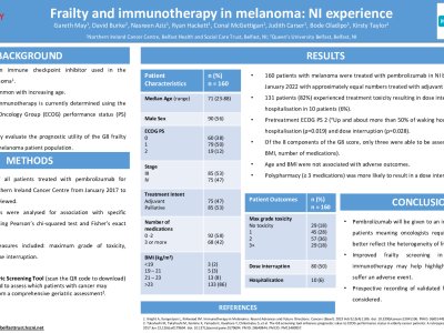 Background: Pembrolizumab is an immune checkpoint inhibitor licensed for use in patients with melanoma. Melanoma is more common with increasing age, requiring oncologists to quantify suitability for immunotherapy. Currently, patient’s fitness for treatment is determined using the Eastern Cooperative Oncology Group (ECOG) performance status (PS) scale. Recently, the G8 frailty screening tool has been developed to enhance prognostic value in the geriatric oncology population. Methods: Records of all patients treated with pembrolizumab for melanoma in the Northern Ireland Cancer Centre from