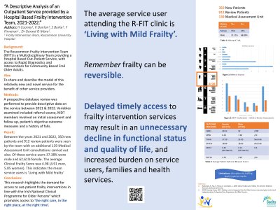 Introduction: The Frailty Intervention Team (FIT) is a multidisciplinary team that provides a service to community based frail adults. This particular service is novel in the sense that it is a hospital based out-patient service as opposed to frailty at the front door or a community based service and has access to rapid diagnostic and intervention services. Aims: The aim of this research is to share and describe the model of this relatively new and novel service for the benefit of other service providers. Method: A prospective database review was performed to provide descriptive data on the