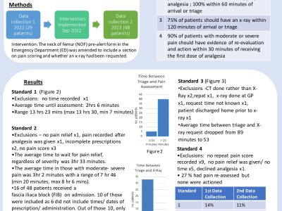 Introduction In the United Kingdom an average of 65,000 patients attend hospital with hip fractures each year, with 87% of these patients over the age of 70. Effective pain management is associated with significantly improved outcomes. Pain is known to be a significant trigger for delirium which itself greatly increases 1 year mortality and morbidity. Given the magnitude of the issue, this audit aimed to assess the effectiveness of an intervention in relation to the NICE National Standards for Neck of Femur (NOF) fractures at Weston General Hospital. Methods Data sets were collected from NOF