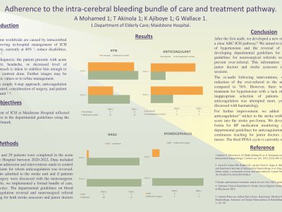 Introduction: Intracerebral haemorrhage (ICH) accounts for 10-20% of strokes worldwide. Mortality is high at 40% and survivors might suffer from severe disabilities that massively impact quality of life and independence. Diagnosis and treatment are straight forward. A non-contrast CT head scan is diagnostic. Treatment is focused on prompt anticoagulation reversal and blood pressure control, with consideration of surgery in appropriate cases and admission to an acute stroke unit or an intensive care unit. Methods: Two PDSA cycles of 28 and 29 patients were completed in the acute stroke Unit