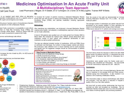 Introduction AFU aims to provide Comprehensive Geriatric Assessment to frail, older service users. A key component is Medication Review. Patients living with frailty are more susceptible to medication side-effects and are often on Falls Risk Increasing Drugs (FRIDs 1) and medications with Anticholinergic Burden (ACB 2) effects, which can cause falls/confusion/delirium/hallucinations. Aiming to reduce inappropriate polypharmacy, ACB and FRIDs scores, and optimise bone health is therefore essential. Data highlighted only 17% of patients received Medication Review by a Pharmacist, which needed